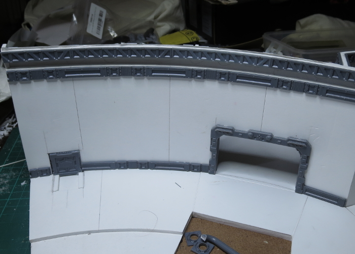 To give the walls some structural detail, I built up a recurring pattern using the support struts from the terrain sprue, and glued this on along the top and bottom of each wall. For curved walls, I carefully bent the strut to shape before gluing it in place.
