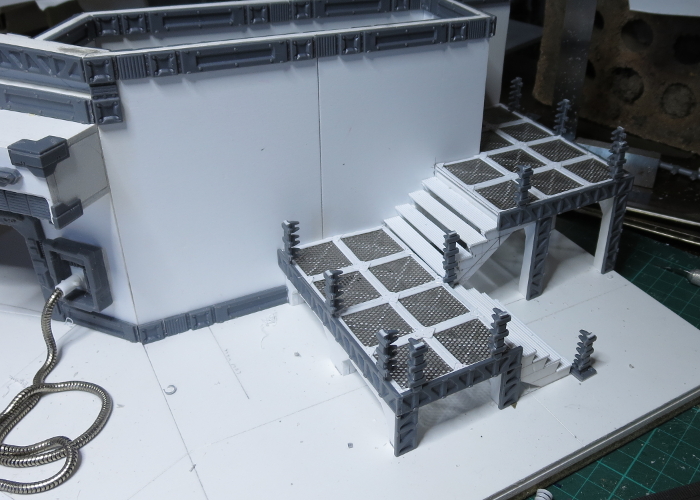 With the legs in place, I added some extra supports for staircases, cut from more PVC. I used strips of textured plasticard for the stair treads. For the moment, I left the platforms and the treads on the lower staircase unglued, to make it a little easier to paint underneath them.