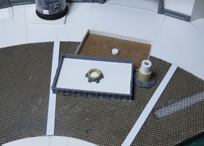I broke up the vast expanse of flyscreen on the pad with a couple of strips of plasticard, and added a curved strip around the edges to conceal the join between the screen section and the solid floor.
