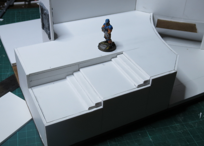 The courtyard needed some depth to allow for some staggered model positioning, so I added a couple of descending platforms on the rear, using layers of PVC to create the steps between levels.